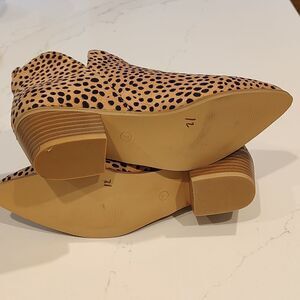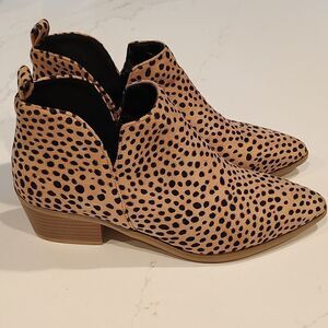 Cheetah print slip-on ankle booties. Cute style with a v slit on each side of the ankle. Great transitional bootie for summer, fall and winter. 2" heel. Size 7.