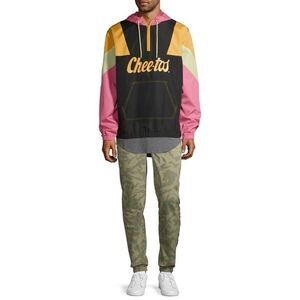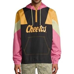 The Cheetos Chester Cheetah Graphic Colorblock Pullover Anorak is a stylish and colorful jacket for men in size medium. Made of polyester with a softshell fabric type, this mid-length jacket features a zip closure and comes in a vibrant multicolor design. Perfect for all seasons, this lightweight and wind-resistant jacket is ideal for staying warm and comfortable in various weather conditions. With its hooded style and retro cartoon theme, this Cheetos jacket is both practical and fun for everyday wear.