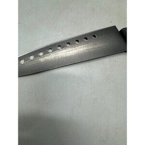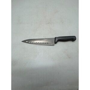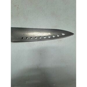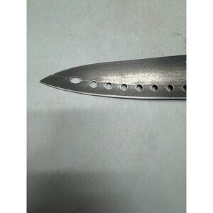 This chef knife features a Teflon-coated blade designed for precision slicing and dicing. Its ergonomic handle provides comfort during extended use, making it suitable for both professional chefs and home cooks. The knife's unique holes reduce friction, ensuring smooth and efficient cuts.