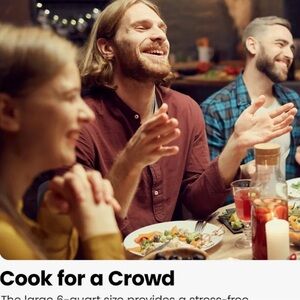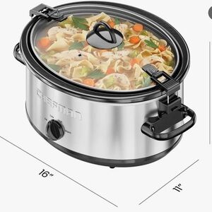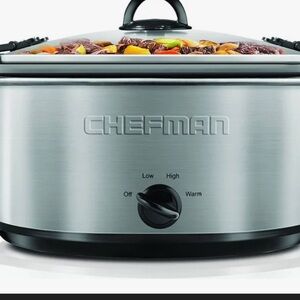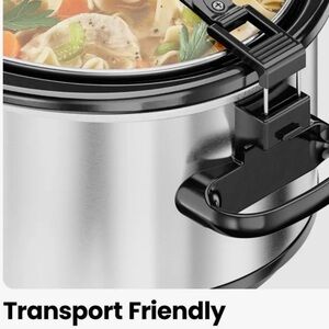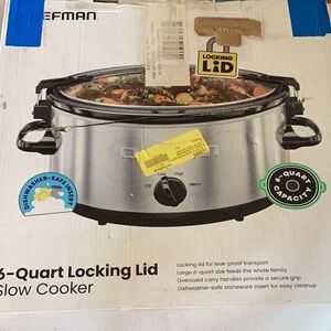 The Chefman Silver Slow Cooker features a locking lid for easy transport and a large 6-quart capacity, perfect for family meals. Its dishwasher-safe insert ensures easy cleaning.