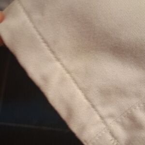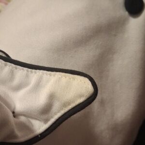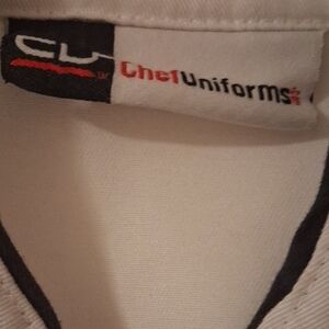 Women's White Chef's jacket with black trim, cloth buttons, a fitted tie-back and cuffed sleeves. Thick material and very well made. There are 2 light stains, THAT I CAN SEE, shown in 2 of the last pictures. Bon Apeptit!