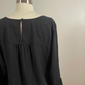 Features: Black long sleeve romper, lace up neckline, bell sleeves, back keyhole button closure, stretch elastic waist