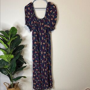 Chelsea 28 floral midi dress with short puff sleeves and scoop neckline. Sleeves can also be worn pulled down to show off shoulders. Feminine and classy. Size medium. Has a small amount of smocking on waist line for a flattering fit.