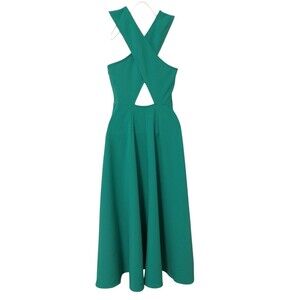 This Chelsea 28 dress in size XS features a solid green color with a sleeveless design and a crew neck. It has a full skirt fit and flare style, with a midi length and convenient pockets. Made of polyester, spandex, and rayon in a knit fabric.