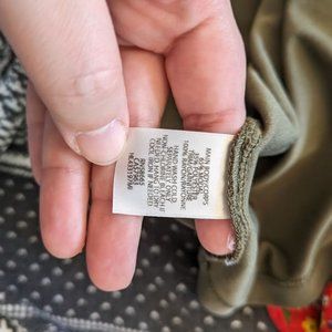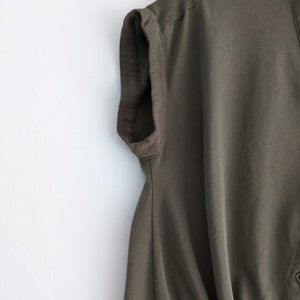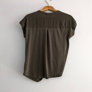 Chelsea28 olive green blouse. The shirt has a v neckline with buttons going down the front of the shirt. The bottom kind of twists into itself giving a fun peekaboo look. It has short sleeves. A great casual piece! Size XXS