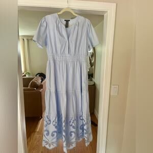 Beautiful sky blue color with eyelet trim. Great summer dress for wedding guest, bridal or baby shower, or date night!