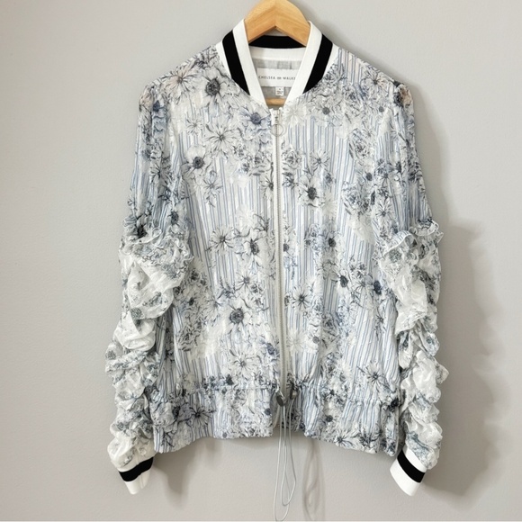 Style Tags: Chelsea and Walker Silk bomber jacket size 4 Chelsea & Walker Tamara jacket ruched sleeves white silk jacket blue black print