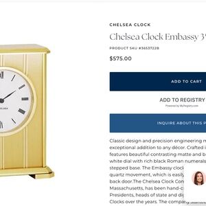 Classic design and precision engineering make this timepiece an exceptional addition to any décor. Crafted in brass, the Embassy features beautiful contrasting matte and bright finishes, a brilliant white dial with rich black Roman numerals, and a handsome stepped base. The Embassy clock keeps perfect time with a German quartz movement, which is easily accessible through the hinged back door.The Chelsea Clock Company located in Chelsea, Massachusetts, has been hand-crafting clocks for 120 years. Presidents, heads of state and dignitaries have received Chelsea Clocks over the years. The company started in 1897 and has supplied the US navy and armed forces with military clocks. Chelsea Clocks make the perfect gift for any occasion, be it business, anniversary, graduation or birthday.