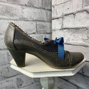 Trendy oxford inspired heel with a scalloped low cut collar. Ribbon lace ties make this shoe extremely flirtatious with a very girly twist. Slate grey leather blue ribbon lace up.