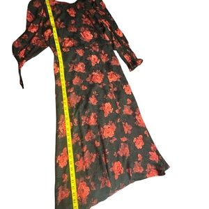 This stunning dress features a ruffled, tiered design in striking red and black, perfect for a wedding guest or cocktail event. The long bishop sleeves and crew neck add a touch of elegance to the sundress style, making it a standout choice for any special occasion.