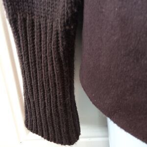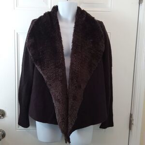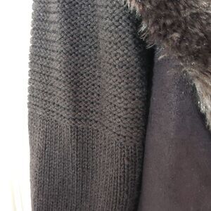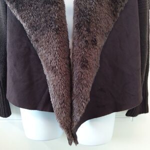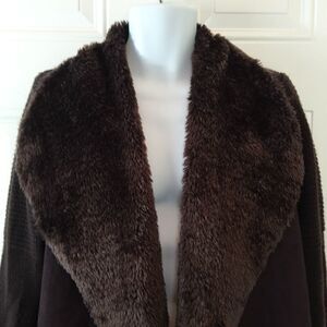 Chelsea & Theodore Brown faux suede, faux fur open front sweater. The front of the sweater is faux suede and faux fur, the back and sleeves are sweater.
