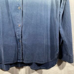 This button down shirt is unique with its ombré blue colored style. The fabric is soft and very comfortable. Gently worn. No flaws. Excellent Condition! Like New!