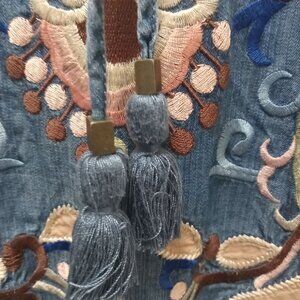 This is a pretty denim dress with exquisite embroidery detail. Neck line and sleeves have grommet detailing. Dress has pockets. Size S.