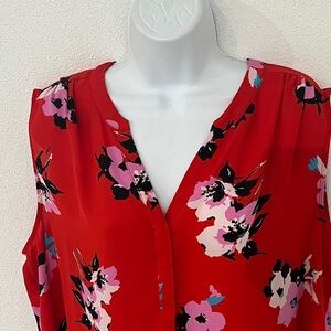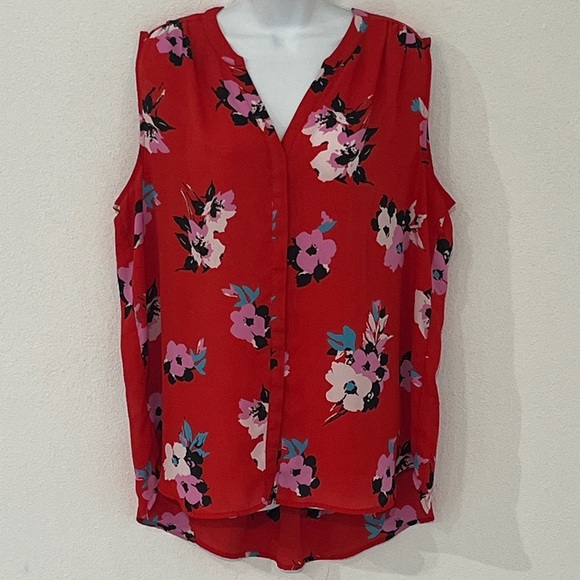 This vibrant red sleeveless blouse features a beautiful floral pattern, perfect for adding a pop of color to your wardrobe. Ideal for casual outings or a day at the office. Excellent condition! Pit to pit measures 24”. Non smoker home