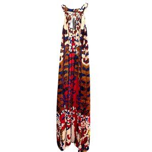 This sleeveless maxi dress from Chelsea & Theodore features a vibrant multicolor abstract print, making it a standout addition to any wardrobe. Designed with a flowy silhouette, it offers comfort and style for various occasions. Crafted from 100% polyester, it's lightweight and easy to care for. New with tags.