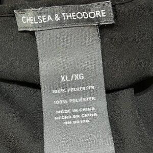This elegant Chelsea & Theodore tank top blouse features a V-neck and layered hem for a stylish look. Perfect for casual or formal occasions, this versatile piece in black is designed for comfort and sophistication.