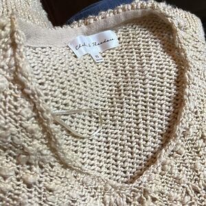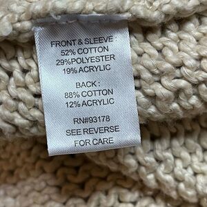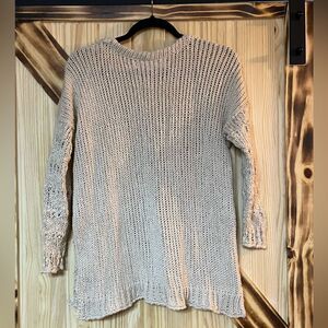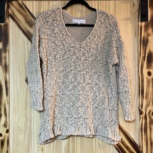 Oversized nobby knit sweater has a round neck, 3/4 length sleeves, tennis hem is vented at the sides. Textured knit work in the front and on the sleeves. The back is like shaker knit. Very versatile layered, or alone it has a very classy California vibe.