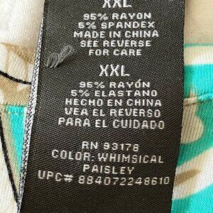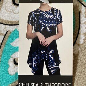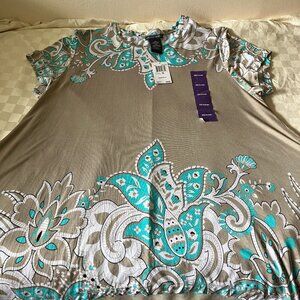 Chelsea & Theodore Women's Boho Mini Dress/Blouse/Top. New with tag. Size XXL. Beige color with White/Turquoise floral pattern, Asymmetrical bottom line, short sleeves. Made of 95% Rayon, 5% Spandex.