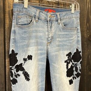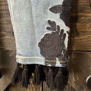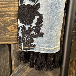 Chelsea & Violet C&V brand ankle jeans. Size 27. Black floral embroidery details. Fringe tassels on hem. Skinny leg. Artsy. Eclectic. Stretch denim. Boho chic style. Mid rise. Preloved. Please see all photos for condition.