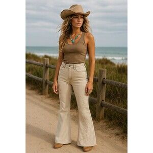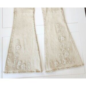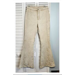 Chelsea & Violet Beige Flare Jeans 30 Embroidered Floral Boho Stretch Denim NWT