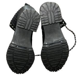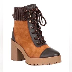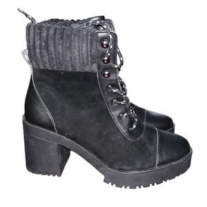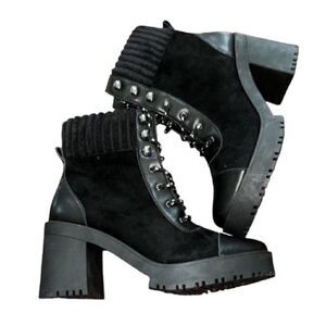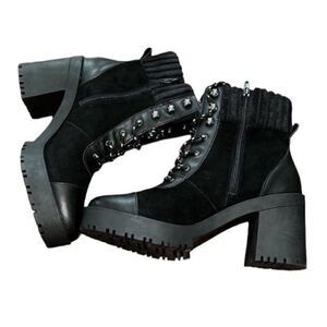 Chelsea & Violet Black Leather and Suede Lug Sole Platform Booties.Cover photo for reference only. Lace up closure.