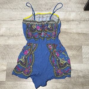 Stylish blue jumpsuit with vibrant paisley pattern. Features adjustable straps and drawstring waist.