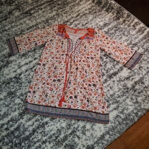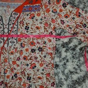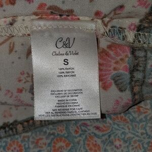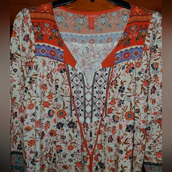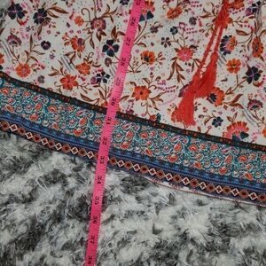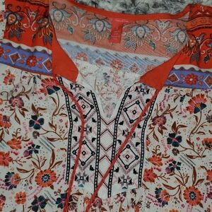 This vibrant dress is 100% Rayon. It is silky and flowy. Gently used, no known flaws. Absolutely gorgeous and wonderful for hot weather!