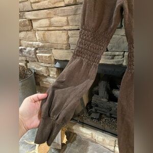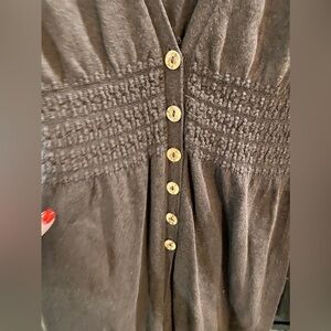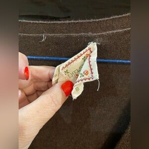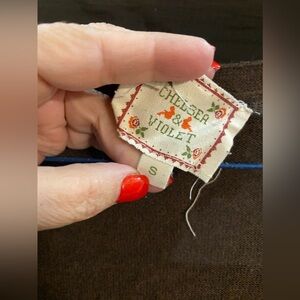 Size small . Adorable design with elastic at waist and on sleeve - see pics . Wooden buttons . Only flaw is tag is coming off - see picture. Color brown .