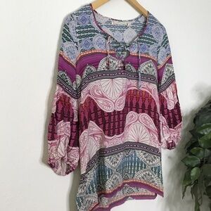 A beautiful, colorful blouse with a fun mix of designs. A vcut front with a criss cross string detail. Loose fitting with bubble sleeves that have elastic around the wrists. Three quarter sleeve cut.