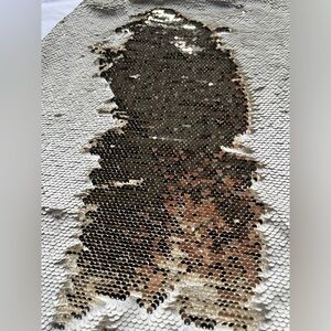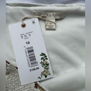 Brand New With Tags. Chelsea & Violet Cream and Gold Flip Sequin Midi Skirt. All over flip sequins, one side is matte cream/off white and the other side is metallic gold. Hidden zipper up the side. Slit on the left leg. MIDI length. Size 10.