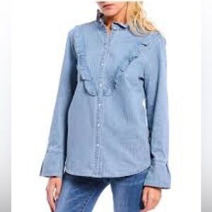 Chelsea & Violet Denim Blue Ruffle Button Down Long Sleeve Top Size L Cotton