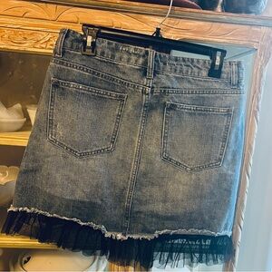Stylish denim skirt with distressed details. Features black fringe hem. Perfect for casual outings. Waist 16 inches. Length 16 inches.