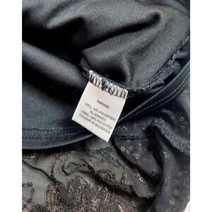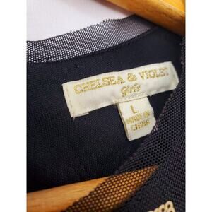 This beautiful semi formal dress from Chelsea & Violet is perfect for any special occasion. The dress features a round neckline with a button closure, and is made from a blended fabric that includes spandex and polyester . The dress is adorned with sequins and a lovely black and gold floral pattern, and has a sheer overlay and a short length. It is fully lined and has a stretchy fit, making it comfortable to wear all day long. It's a girls size L and fits like a 12.