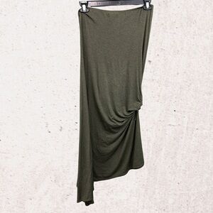 This green midi skirt by Chelsea & Violet features an asymmetrical design with ruched detailing, perfect for casual or work settings. The soft, stretchy knit fabric drapes elegantly, offering a comfortable and stylish look.