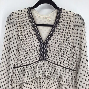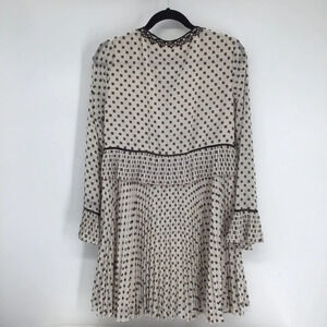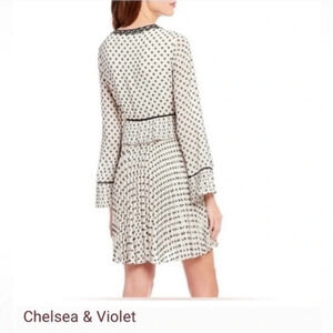 Precious dress from Chelsea & violet. Features accordion pleated skirt with lovely black lace details. Creme & black dot long sleeve dress with ruffle at waist. Dress zips up the side.