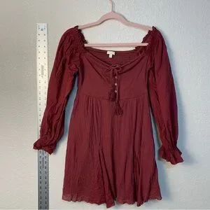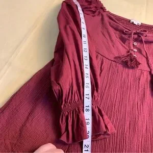 The Chelsea & Violet sundress in a vibrant red hue is perfect for a casual night out. Featuring a scoop neckline and bishop sleeves, this dress combines elegance with comfort. The ribbed texture and ruffled details add a playful touch to its sophisticated design. All cotton with poly lining, good condition