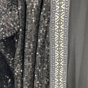 Black in color with all over sequins, black & white Southwestern trim, fully lined, sleeves stop between elbow and wrist.