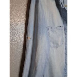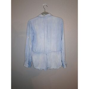 Chelsea & Violet Women's Light Wash Denim Button Down. Lightweight. Frayed Hem. Cuffed Sleeves. Back is longer than the front. Pockets. Perfect for Spring and Summer. Size Small. Excellent Used Condition.