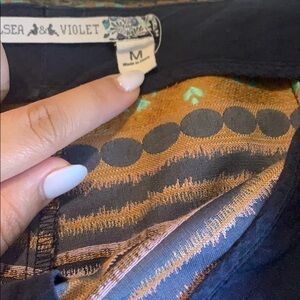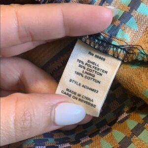 No pockets Slide hook and hidden button front closure with zipper 70% polyester 30% cotton Great condition no holes or stains