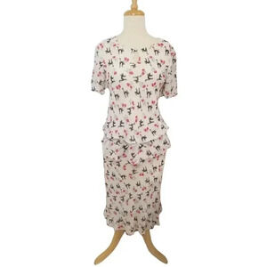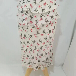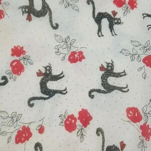 Print: Red Rose's and Black Cats with Red Dots throughout. Ruffled Style.