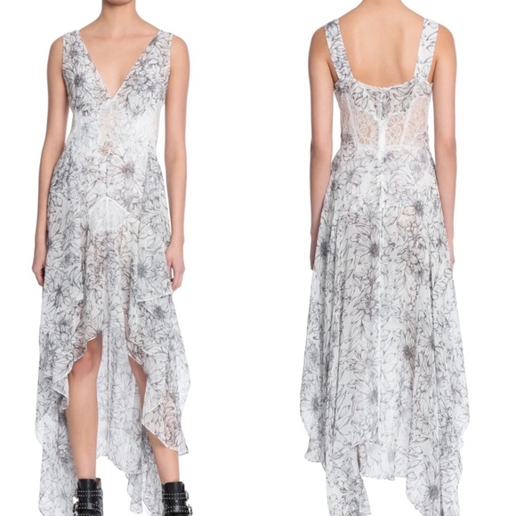 Sleeveless silk and lace floral print dress with asymmetrical hem