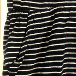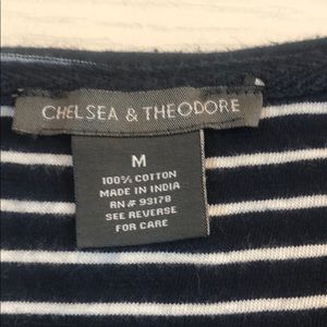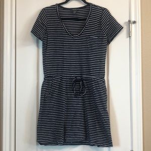 Super cute! Perfect for Summer into Fall. Chelsea and Theodore Navy blue and White stripe V-Neck, Drawstring waist Dress. Pocket on left chest. Pockets at waist. Size Medium