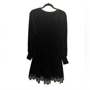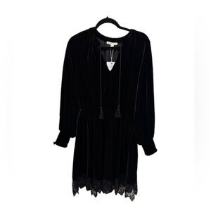 From Chelsea & Violet, this dress features: Stretch velvet fabrication. Fit and flare silhouette. Split self-tie tassel detailed neckline. Smocked cuffs. Long sleeves. Lace trim at the hemline. Pullover construction. Polyester/spandex. Machine wash. Brand new with tag!