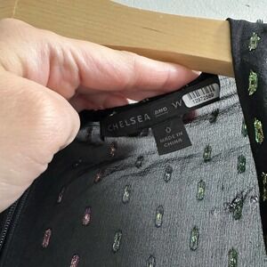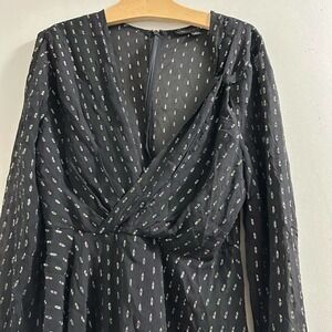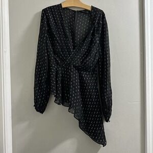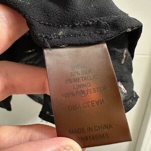 Black metallic printed silk (85% Silk, 15% Metallic). Top. Long sleeves. V-neckline. Hook-and-eye closure at the back. Partially lined. 24" from shoulder to hemline. Imported.