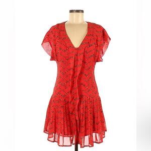 Soft patterned drop waist dress with open back slit and sheer ruffle overlay. There is not much for stretch, and no pockets.