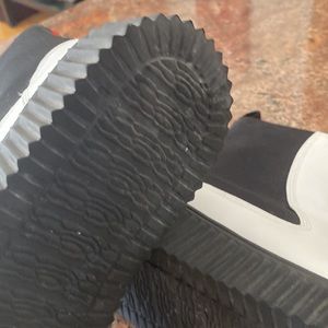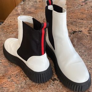 Chelsea boat, white leather upper, 6” shaft, 1” platform sole. Pull on style with black elastic insets and heel pull tabs. Textile lining, rubber sole. Modern streamline style.