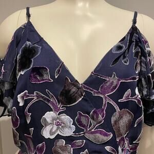 Elevate your wardrobe with this stunning Chelsea28 dress, designed to make an impression at any special occasion. Crafted with a luxurious burnout velvet overlay, this dress features a romantic floral pattern in rich shades of purple, silver, and black on a sheer navy mesh backdrop. The deep V front, cold shoulder cut with adjustable straps, flutter sleeves and delicate spaghetti straps adds a flirty, feminine touch, while the ruffle hemline creates graceful movement with every step.