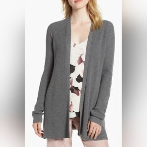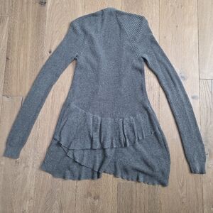 Chelsea28 ruffle gray open front knit cardigan. Size XS but runs slightly large. This pretty cardigan is knit with a mix of stitches and asymmetrical tiers of ruffles in back. This is in good used condition with some minor signs of wear and slight hanger mark on shoulders. This is cozy and perfect for layering. Smoke free home.