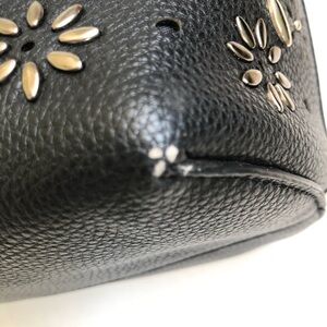 The bag features silver studded embellishments on black faux leather. Very beautiful I just don’t have use for it. I do not have the little pouch it comes with