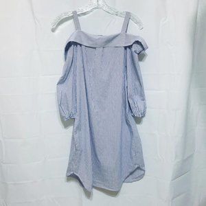 This Chelsea28 Off Shoulder Blue and White Striped Top is in a size XS. This is very gently used with no flaws or fading. The fabric on this button up shirt has a fold over ruffle effect from the chest area around the back. There are 2 arm straps and off the shoulder sleeves, which go to the middle of the forearm. The sleeve cuffs are elastic.